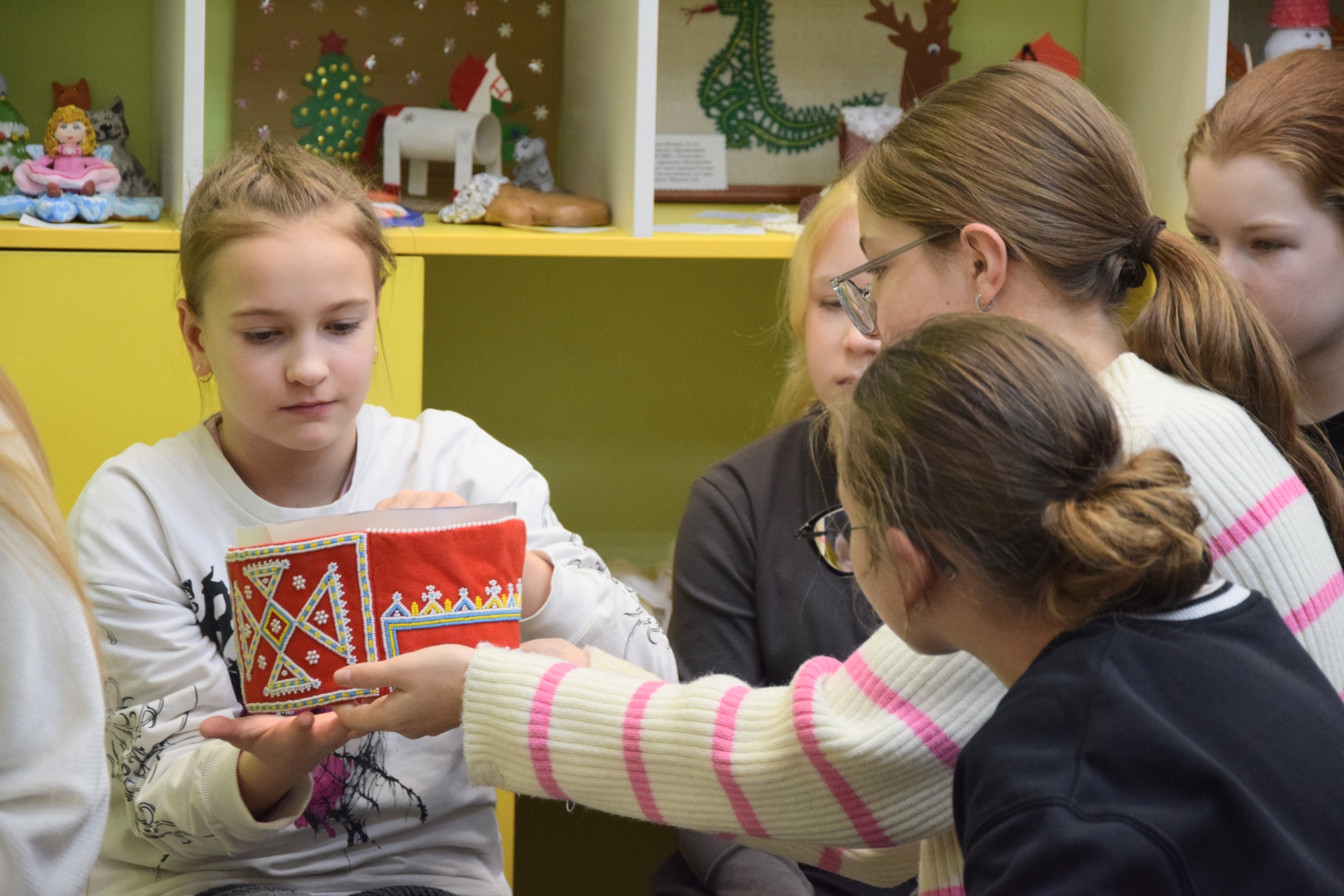Сестры рассказали о своем многочисленном роде Захаровых-Юшковых, Пелькиных-Дмитриевых, исполнили приветственные напевы на родном языке, познакомили с традиционными ремеслами – резьбой по дереву и капу, кости и оленьему рогу, продемонстрировали предметы национальной одежды, сшитые и украшенные бисером вручную. Юным зрителям было предложено поиграть, примерить головные уборы и даже стать участниками импровизированного музыкального ансамбля, с чем они прекрасно справились.