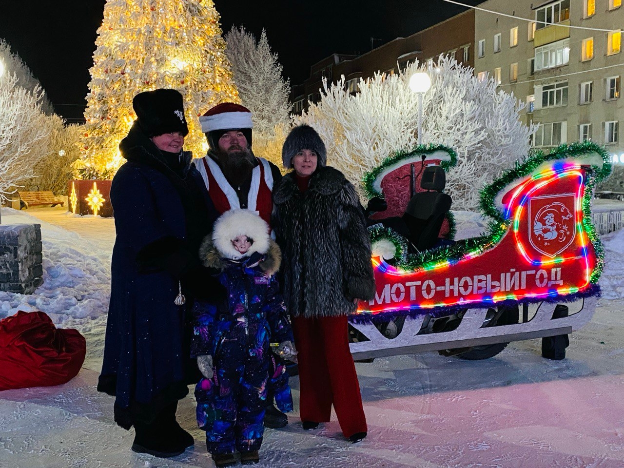 В гости к оленегорцам приехали Дед Мороз и Полярная ночь на сказочных мотосанях. Добрые волшебники поздравили детей и взрослых с Новым годом и подарили ребятам подарки, собранные с душой и любовью. Все желающие смогли сфотографироваться в ярких санях.