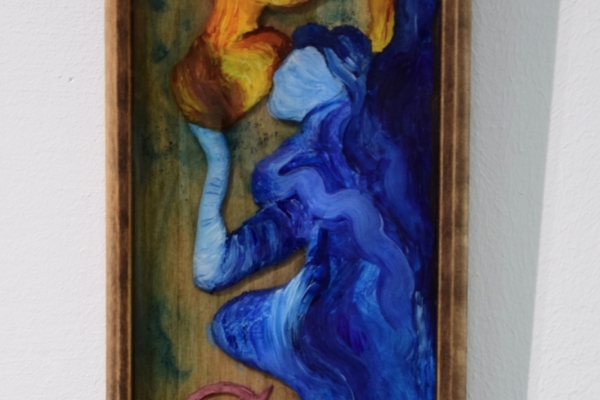 Анна Миняк презентовала свою работу «Любовь», выполненную на деревянном подносе с использованием глины, эпоксидной смолы и акрила.