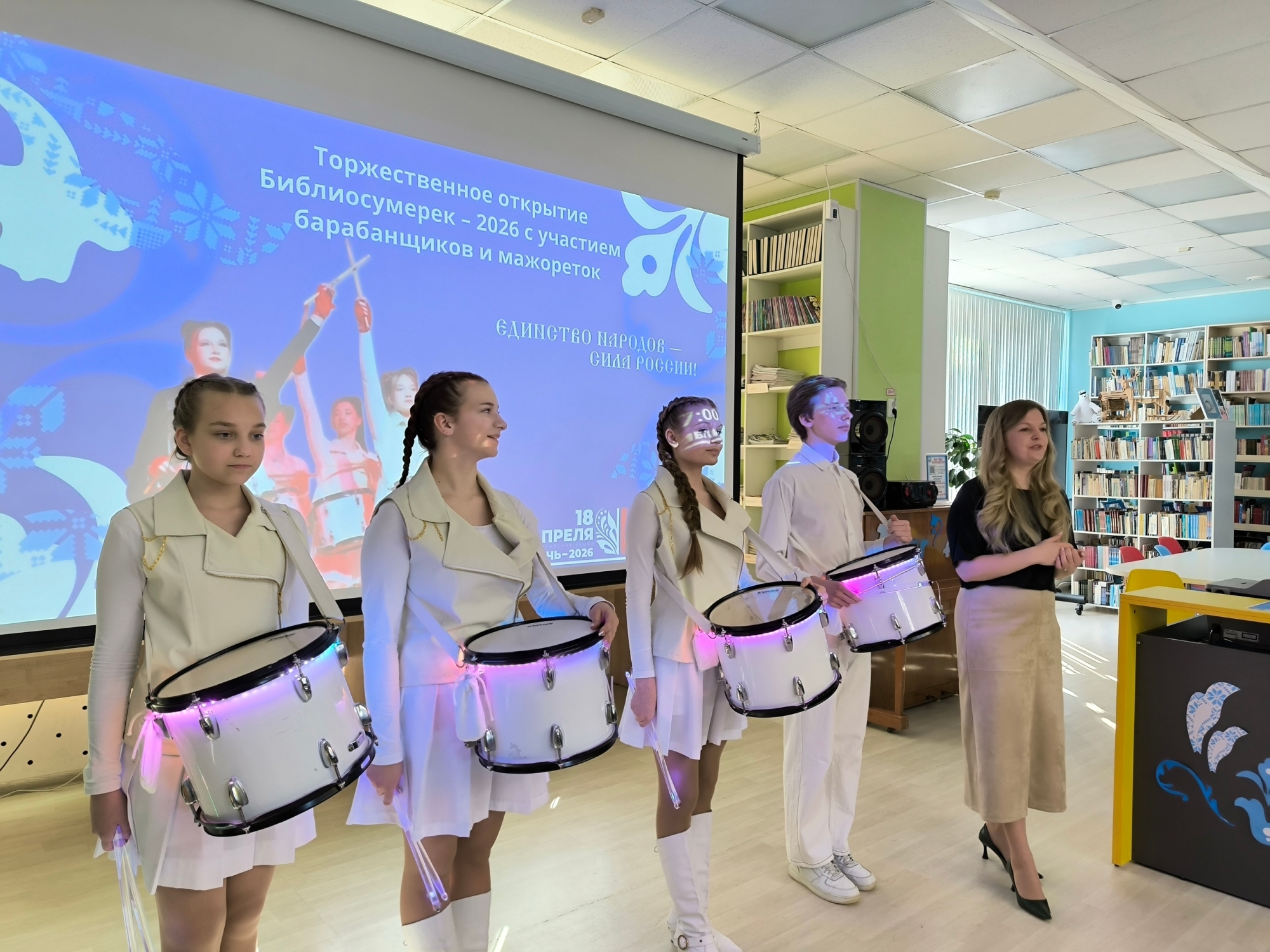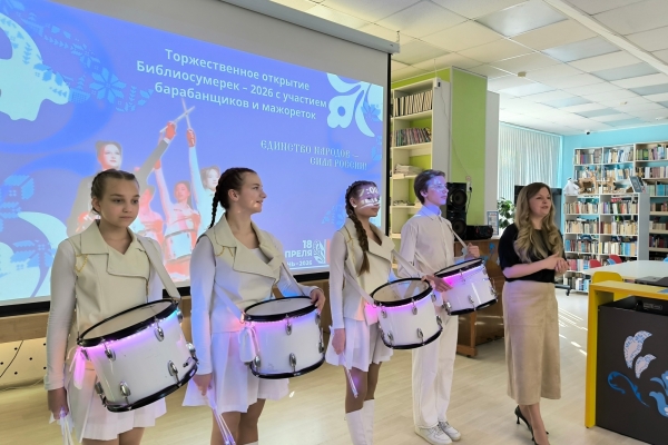 Для самых юных читателей в Центральной детской библиотеке «Морозко» прошли «Библиосумерки-2026» – особый формат «Библио-ночи» для детских библиотек, которые начинают праздник чуть раньше, чем взрослые, в силу юного возраста своих читателей. Вечер открылся зажигательным выступлением коллектива барабанщиков и мажореток под руководством Анастасии Рыбниковой. С приветственным словом к участникам обратилась Оксана Чаликова, заместитель начальника Отдела по культуре, спорту и делам молодежи Администрации Оленегорска.